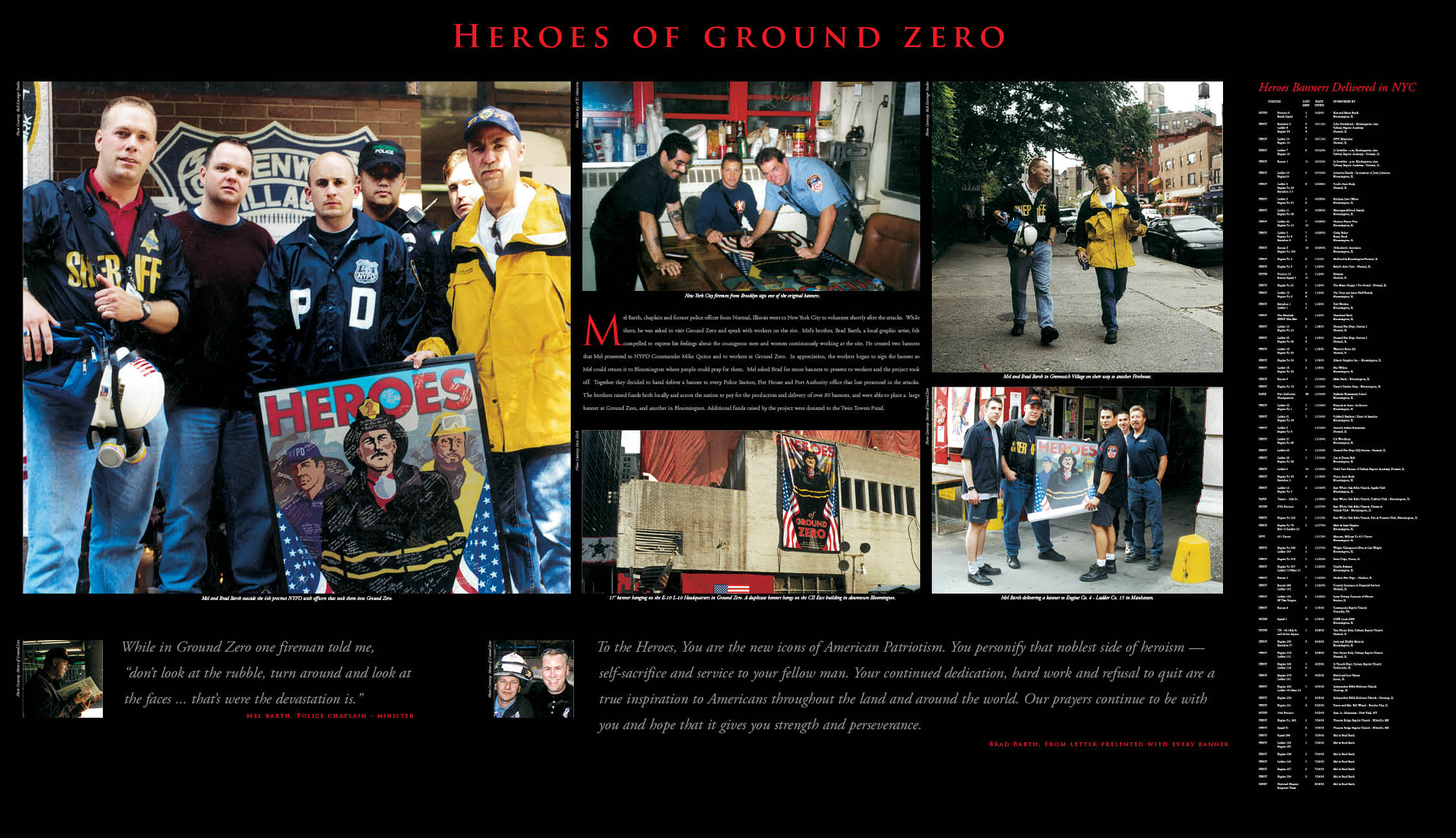 This is one panel of the Heroes of Ground Zero story that was displayed at the 1-year anniversary of 9/11 at the McLean County Museum of History. It contains a list of all banners delivered to NY and the people, businesses, and organizations that sponsored them.